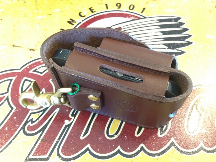 黒と茶色のレザーケースです。インディアンの横顔の5セントコンチョが付いていてかっこいいです!