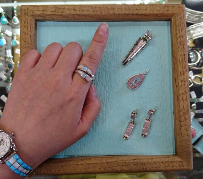 シェルはその名の通り貝殻で、インディアンジュエリーではズニ族のインレイワークの材料としてよく用いられます。光沢があってキレイなピンクシェルのアイテムは上品で可愛いのでおすすめです 😉